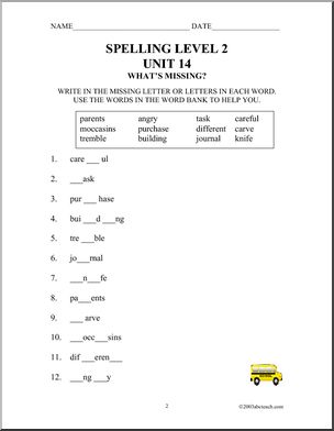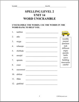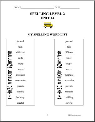 Use this ‘Spelling Level 2, unit 14 (elementary)’ printable worksheet in the classroom or at home. Your students will love this ‘Spelling Level 2, unit 14 (elementary)’. Worksheets to help learn these spelling words: journal, task, different, knife, angry, carve, purchase, moccasins, parents, tremble, building, careful. Cloze exercise, word search, crossword, missing letters and more!