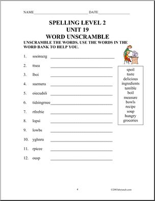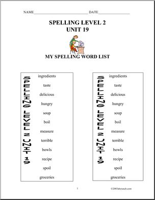 Use this ‘Spelling Level 2, unit 19 (elementary)’ printable worksheet in the classroom or at home. Your students will love this ‘Spelling Level 2, unit 19 (elementary)’. Worksheets to help learn these spelling words: ingredients, taste, delicious, hungry, soup, boil, measure, terrible, bowls, recipe, spoil, groceries. Cloze exercise, word search, missing letters and more!