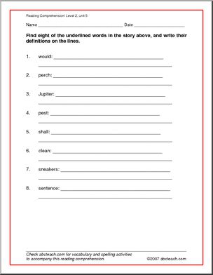 Use this ‘Spelling Level 2, unit 5 – reading work (elementary)’ printable worksheet in the classroom or at home. Your students will love this ‘Spelling Level 2, unit 5 – reading work (elementary)’. A reading comprehension and extended vocabulary work to go with the spelling unit on abcteach.