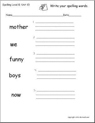 Use this ‘Spelling Level K, unit 13’ printable worksheet in the classroom or at home. Your students will love this ‘Spelling Level K, unit 13’. Worksheets to help learn these spelling words: mother, we, funny, boys, now. Cloze exercise, word search, missing letters and more!