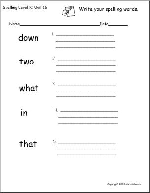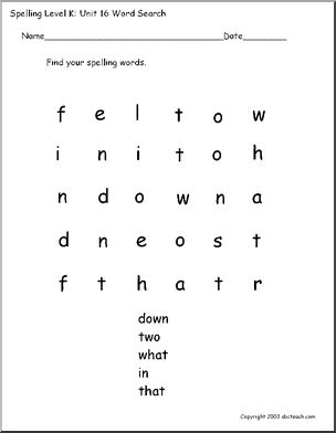 Use this ‘Spelling Level K, unit 16’ printable worksheet in the classroom or at home. Your students will love this ‘Spelling Level K, unit 16’. Worksheets to help learn these spelling words: down, two, what, in, that. Cloze exercise, word search, missing letters and more!