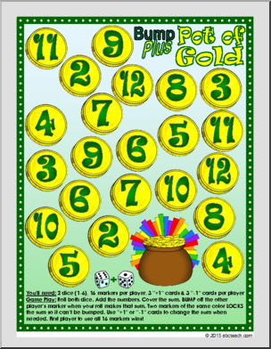 A new plus to the popular Bump game where players roll dice, add, and cover the sum. This colorful St. Patrick’s Day set includes 4 addition games; 2 addends, 3 addends, 4 addends, and doubles. Laminate for a fun, reuseable classroom game.
