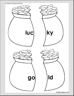 Match word parts to make St. Patrick’s Day vocabulary words with these cute pots of gold. These black/white outlined puzzles are a great St. Patrick’s Day activity for students to cut, color, match, paste and write.