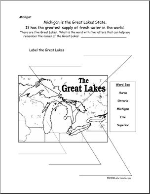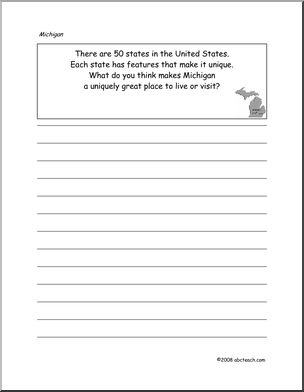 KWL, writing prompt, word search, state symbols, map reading, neighboring states, a flag to color, plus Michigan-specific worksheets (Great Lakes, Penninsulas, etc.).