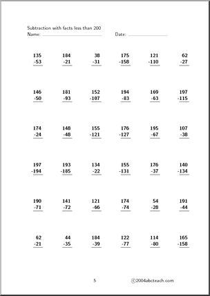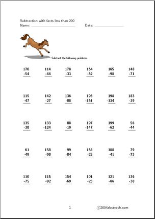 This Subtraction – facts up to 200 (set 1) Clip Art is perfect to practice subtraction skills. Your elementary grade students will love this Subtraction – facts up to 200 (set 1) Clip Art. Printable substraction worksheet, working with facts up to 200.