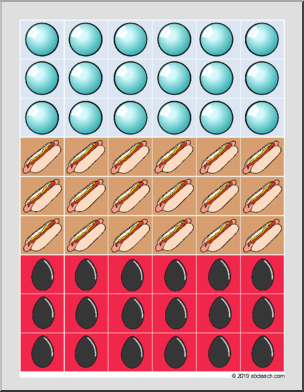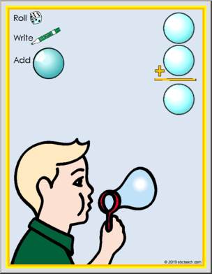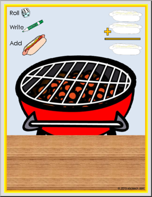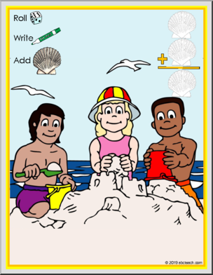 Six, simple, colorful, Summer-themed dice mats. Roll the dice, write the numbers, and add. Two pages of matching counters are included, or use erasers or manipulatives to count on the mat. Laminate for fun, reusable classroom games.