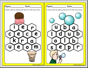 Practice spelling with these fun Summer-themed puzzles. Draw a path from one picture to the other by spelling the word for the top picture. Use each letter only once, and only use letters that touch. Word List: hotdog, baseball, ice cream, bubbles, lemonade, hiking, sun, fireworks, hiking, swimming. Laminate to make reusable puzzles.
