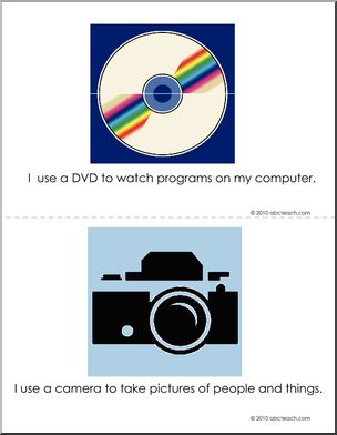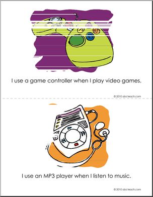 A Technology Booklet(color) for primary students entitled “Things We Use!” with illustrations for: cell phone, DVD, game controller, computer, MP3 player, interactive board, email and Internet. Each accompanied by a simple sentence: “I use a _____ to ____.”