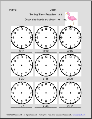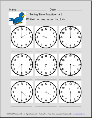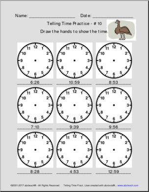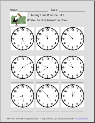 10 pages of practice in telling time including hour, half hour, quarter hour, ten minutes, and minute. 5 pages – write the time, 5 pages – draw hands to show the given time. Created with our abctools Math Worksheet Generator. CC: 1.MD.B.3, 2.MD.C.7