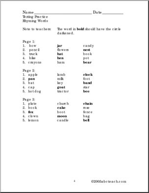 Formatted like a standardized test, this 3 page document tests knowledge of rhyming. This is approximately a skill tested in first grade, although state standards vary widely.