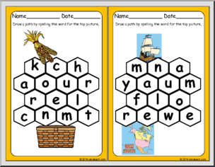 Practice spelling with these fun Thanksgiving-themed puzzles. Draw a path from one picture to the other by spelling the word for the top picture. Use each letter only once, and only use letters that touch. Word List: turkey, pumpkin, cornucopia, gourd, pilgrim, native, corn, Mayflower. Laminate to make reusable puzzles.