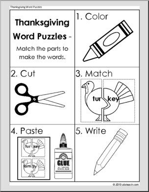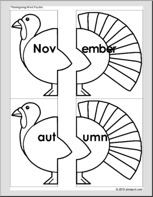 Match word parts to make Thanksgiving vocabulary words with these cute turkeys. These black/white outline puzzles are a great Thanksgiving-themed activity for students to color, cut, match, paste, and write.
