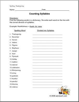 Use this ‘Spelling: Thanksgiving (upper elem)’ printable worksheet in the classroom or at home. Your students will love this ‘Spelling: Thanksgiving (upper elem)’. 20 words, from “blessing” to “tradition”, are presented in this spelling unit, which features dictation, syllable work, abc order, and more.