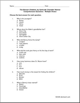 Use this ‘Book: The Boxcar Children (elem)’ printable worksheet in the classroom or at home. Your students will love this ‘Book: The Boxcar Children (elem)’. Includes multiple-choice, short- and long-answer comprehension questions, a writing prompt, vocabulary review and more for the first book in Gertrude Warner’s popular mystery series.