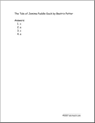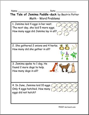 Use this ‘Book: The Tale of Jemima Puddle-duck (primary)’ printable worksheet in the classroom or at home. Your students will love this ‘Book: The Tale of Jemima Puddle-duck (primary)’. Three worksheets (comprehension, vocabulary in context, and simple word problems) to accompany Beatrix Potter’s story of a silly duck.