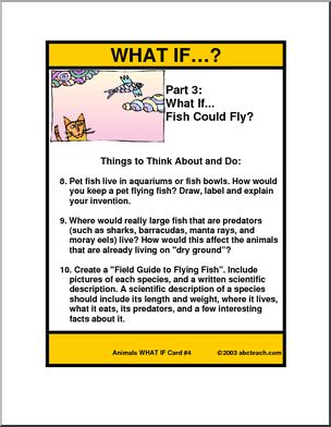 Six creative “What if” cards. Each card presents a question (“What if fish could fly?”) and at least three projects (“Create a poster showing how flying fish would adapt to life on land.”) to elicit creative thinking.