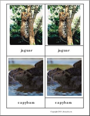 Three-part cards; photographs of ten rain forest animals: sloth, toucan, tree frog, jaguar,etc.