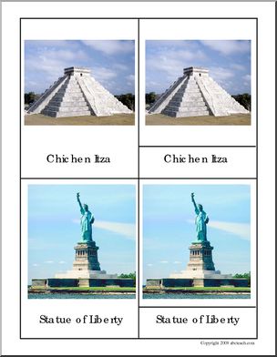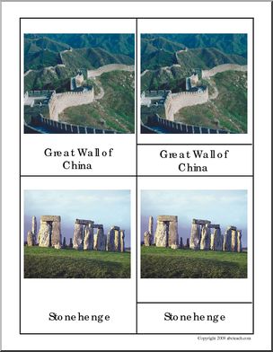 3-part cards; photographs of Big Ben, Eiffel Tower, Great Wall, Taj Mahal, Stonehenge…