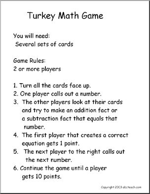 This Turkeys Math Game is perfect to practice addition and subtraction skills. Your elementary grade students will love this Turkeys Math Game. Students use turkey-shaped cards (numbered 1-20) to make addition and subtraction equations. Instructions included.