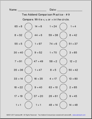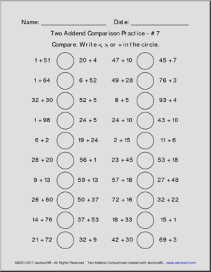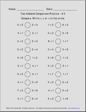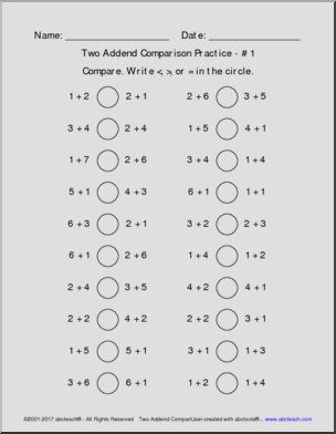 10 pages of comparison practice with two-addend expressions. Write <, >, or =. Created with abctools Math Worksheet Generator. CC: 1.NBT.T.3