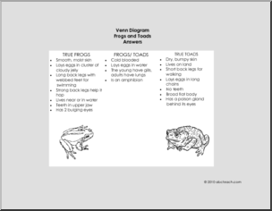 Venn diagram to help students organize and understand the similarities and differences between frogs and toads, with answer key.
