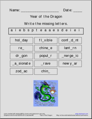 A set of three medium difficulty vocabulary activities, created with abctools using 14 words associated with the Chinese New Year, Year of the Dragon: word search, crossword puzzle, word unscramble.