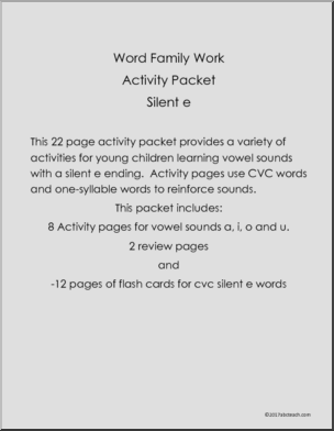 Use this ‘Word Families: Vowel Sounds – Silent ‘e’ (k-2)’ printable worksheet in the classroom or at home. Your students will love this ‘Word Families: Vowel Sounds – Silent ‘e’ (k-2)’. This 22 page activity packet provides a variety of activities for young children learning vowel sounds with a silent e ending.