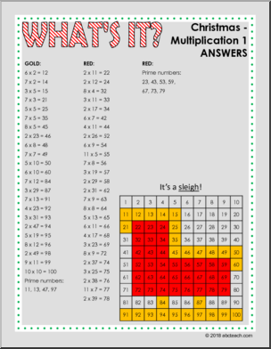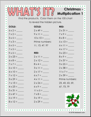 Discover the Christmas mystery picture by finding the products and coloring them on the hundred chart. Great seasonal practice for multiplication within one hundred, and reinforcing prime numbers.