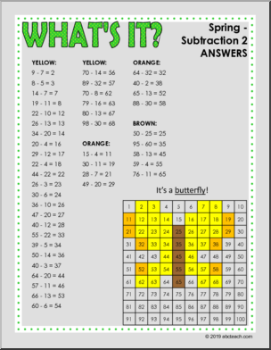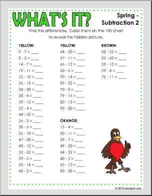 Discover the mystery spring-themed picture by finding the differences and coloring them on the hundred chart. Great seasonal practice for subtraction within one hundred.