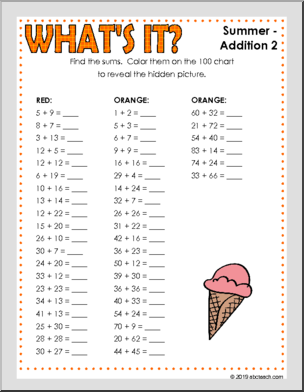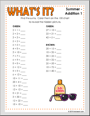 Discover the mystery summer-themed picture by finding the sums and coloring them on the hundred chart. Great seasonal practice for addition within one hundred.