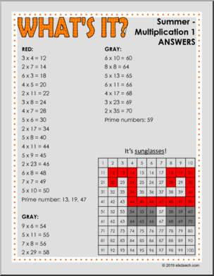 Discover the mystery summer-themed picture by finding the products and coloring them on the hundred chart. Great seasonal practice for multiplication within one hundred, and reinforcing prime numbers.