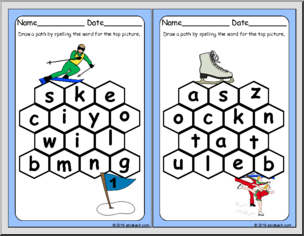 Practice spelling with these fun winter-themed puzzles. Draw a path from one picture to the other by spelling the word for the top picture. Use each letter only once, and only use letters that touch. Word List: snowman, snowflake, shovel, sled, firewood, marshmallow, scarf, mittens. Laminate to make reusable puzzles.