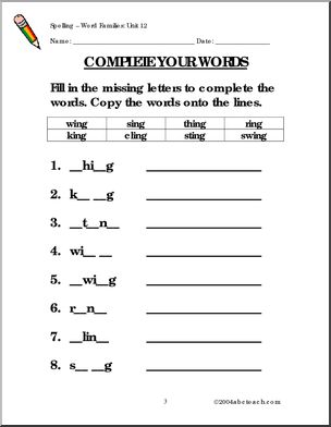 Use this ‘Spelling: Word Families 1– unit 12 “-ing”‘ printable worksheet in the classroom or at home. Your students will love this ‘Spelling: Word Families 1– unit 12 “-ing”‘.