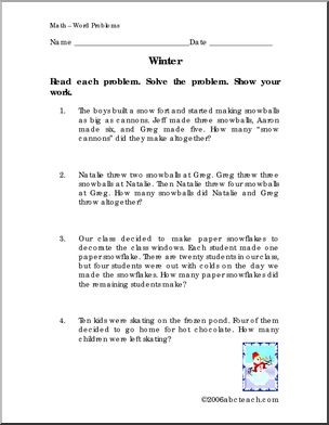 “Jane built five snowmen after the last snowstorm. Two of them have melted. How many of Jane’s snowmen are left?” Eight word problems using addition and subtraction up to twenty.