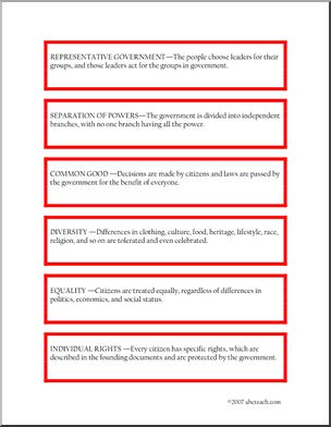 Seventeen democratic values and their definitions. These word strips can be hole-punched and stored on a key chain for easy study.
