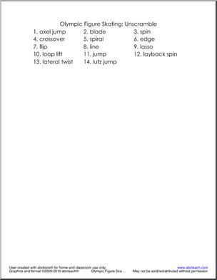 Figure skating related vocubulary in a word unscramble. This vocabulary will be heard at the figure skating events in the winter Olympic games.