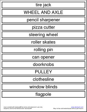 Examples of simple machines, from BOTTLE OPENER to WINDOW BLINDS, can be used as a word wall or word sort tool.
