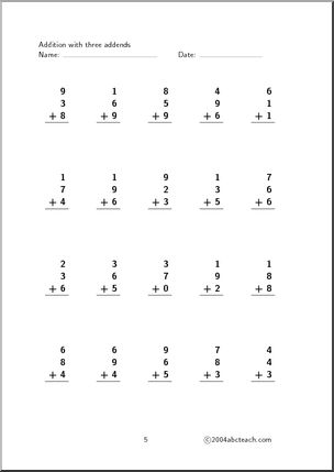 Worksheet: Addition – Three Addends – single digits (set 2)