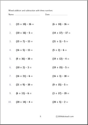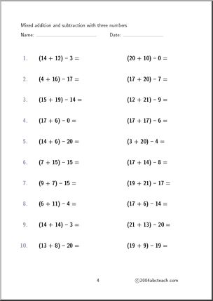 (7+13)-12=; 5 pages; addition and subtraction