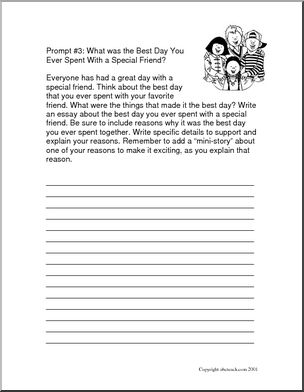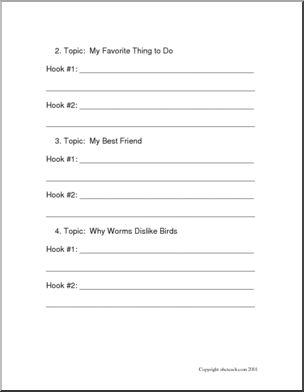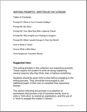 Use this ‘Writing Prompt: Writing Exercises (upper elementary)’ printable worksheet in the classroom or at home. Your students will love this ‘Writing Prompt: Writing Exercises (upper elementary)’. Eight pages of writing prompts and exercises including “how to write a hook,” and “time-sequence transition words”.