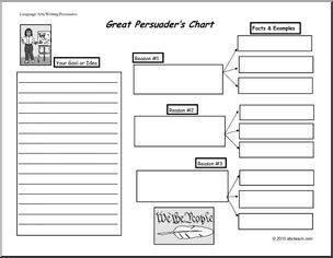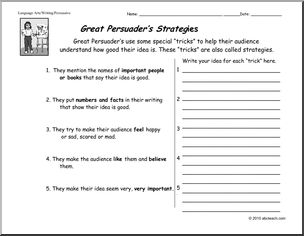 An introductory lesson on persuasive writing with explanation text, and tools to start a persuasive writing project: a planning chart, strategy definitions, and completion exercise. Use with abcteach A Great Persuader Vocabulary Set.