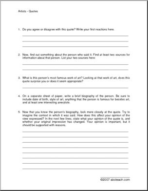 24 quotes from famous artists form the basis for writing prompts that require students to use their skills of reflection, research, and writing.